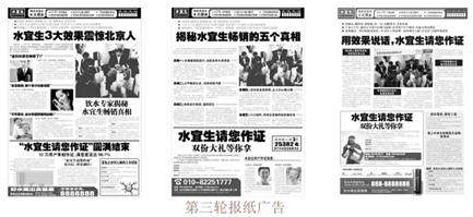 2008年中國營銷界的怪現象必然包括這么一條:水宜生前后花費近2000萬平面媒體費用,在全國主流媒體發布“打假聲明”,近千篇整版、半版廣告集中投放,讓造假者與競爭對手偃旗息鼓,更令他們意外的是,這樣的打假廣告,還可以帶來額外的直接銷售。據不完全統計,一個地級市每投放一篇打假整版廣告,可以接到150多條咨詢與訂購熱,成交200套以上,完全可以做到單版贏利!這就是公關與廣告結合后的瘋狂現象!