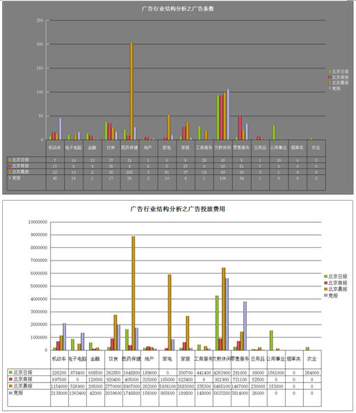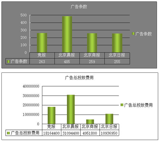 從上面的圖表可以看出,這四家報(bào)紙的廣告總投放量并不是很多:一方面,這個(gè)月的廣告總條數(shù)很少。最多的不過(guò)是《北京晨報(bào)》,才485條,其他三家均為250多條;另一方面,廣告總投放費(fèi)用很低。其中《北京商報(bào)》更是連500萬(wàn)的廣告總投放費(fèi)用都無(wú)法達(dá)到,《北京日?qǐng)?bào)》為1000多萬(wàn),《競(jìng)報(bào)》為1800多萬(wàn)。而《北京晨報(bào)》為3000多萬(wàn),為這四者最高。我們?cè)倌镁┏墙?jīng)營(yíng)規(guī)模前三大報(bào)紙《北京晚報(bào)》《京華時(shí)報(bào)》(它們?yōu)楸本┤請(qǐng)?bào)報(bào)業(yè)集團(tuán)旗下報(bào)紙)和《北京青年報(bào)》的相關(guān)數(shù)據(jù)與這四者進(jìn)行對(duì)比,相信讀者能更深刻理解這四份報(bào)紙目前在京城報(bào)業(yè)中所處的邊緣地位了。