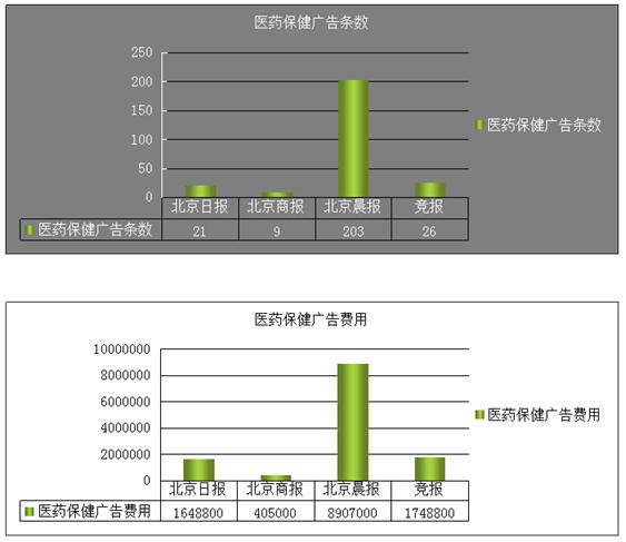 眾所周知,我國(guó)醫(yī)藥保健行業(yè)目前缺乏有效的積極的健全的監(jiān)管機(jī)制。因此,這方面的廣告水平與質(zhì)量也很參差不齊,廣告主的質(zhì)量也相比機(jī)動(dòng)車、家電等行業(yè)遜色不少。為此,我們專門將醫(yī)藥保健行業(yè)廣告進(jìn)行單獨(dú)分析,借此希冀可以在一個(gè)側(cè)面看看這四家報(bào)紙的廣告經(jīng)營(yíng)現(xiàn)狀。