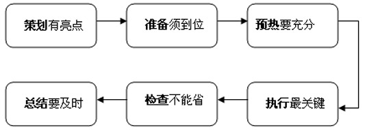 準(zhǔn)備再充分的活動(dòng)都會(huì)有疏忽和不足的地方。因此,執(zhí)行過(guò)程中,檢查環(huán)節(jié)一定不能省。發(fā)現(xiàn)問(wèn)題,盡量當(dāng)場(chǎng)解決問(wèn)題;如果實(shí)在解決不了,要爭(zhēng)取在下一次活動(dòng)時(shí)盡量避免。大型活動(dòng)的執(zhí)行更容不得絲毫的馬虎,否則不但會(huì)走樣變形,而且可能產(chǎn)生惡劣的社會(huì)影響和負(fù)面效果。
