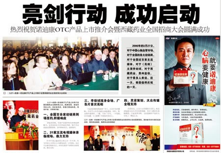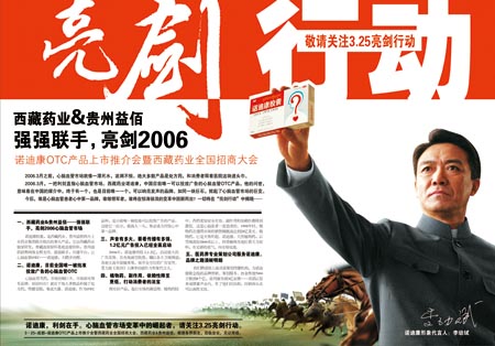 進入2007年,西藏藥業和靈諾共同提出“礪劍2007”的全年戰斗口號。渠道上,諾迪康進入細化和規范階段。終端上,對店員進行深入教育、對終端進行系統維護,系列終端活動也將貫穿全年。傳播上,深度說服將全面展開,央視招標的黃金資源將用于《功能篇》的持久循環播放,地方臺的“心腦健康專題”也將陸續開播;一系列報型平面將以“硬廣+軟文”的形式廣泛傳播,深度說服;廣播、戶外、網絡、雜志、社區……立體傳播模式將繼續發揮威力。2007年,諾迪康已全面進入新的騰飛階段……