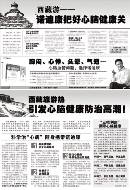 在傳播上,靈諾相繼推出《高原通天路,發現心腦良藥!》、《青藏鐵路通車,心腦病人發現意外驚喜!》等一系列平面廣告,精確投放到各地市場。與此同時,諾迪康電視廣告《功能篇》“胸悶、心悸、頭暈、氣短,心腦血管問題,諾迪康膠囊,雪域高原植物藥,益氣活血效果好,防止突發護心腦。心腦要健康,選擇諾迪康”也開始在央視和全國各大衛視熱播。