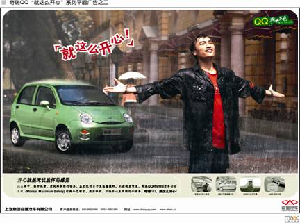 盡管QQ在時尚個性上出足風頭,大都會廣告卻時刻提醒自己不能“做過了頭”。因為,QQ不是“甲殼蟲”,中國的汽車消費環境也和國外的截然不同。QQ還是一款大眾微車,它還要追求較大的銷量和市場占有率。因此需要避免其走入“小眾化”的窄巷。因此,從2004年3月起,QQ醞釀著品牌文化塑造的第二張牌:就這么開心!
