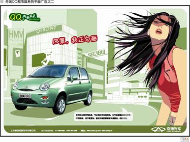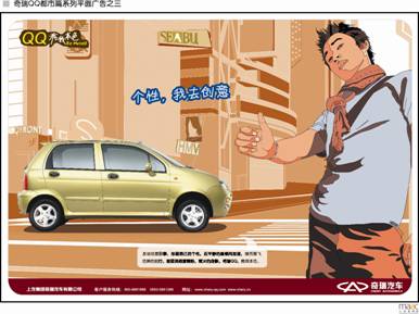 在大眾傳媒上,奇瑞QQ時尚、新銳的系列平面廣告,把QQ可愛、俏皮、個性的形象傳達得淋漓盡致,而“奇瑞QQ,秀我本色”的廣告語也成為“2003十大汽車廣告口號”之一。